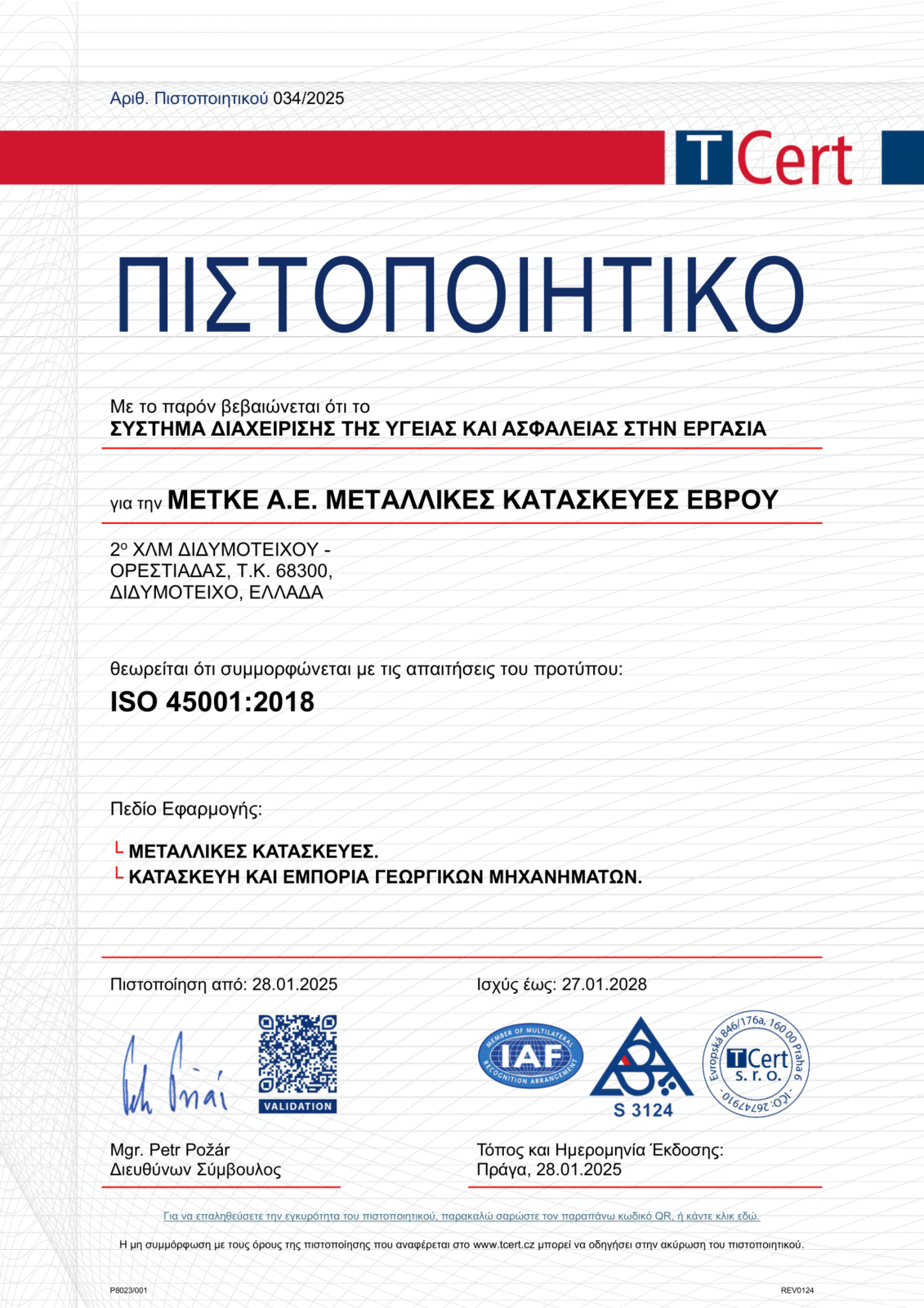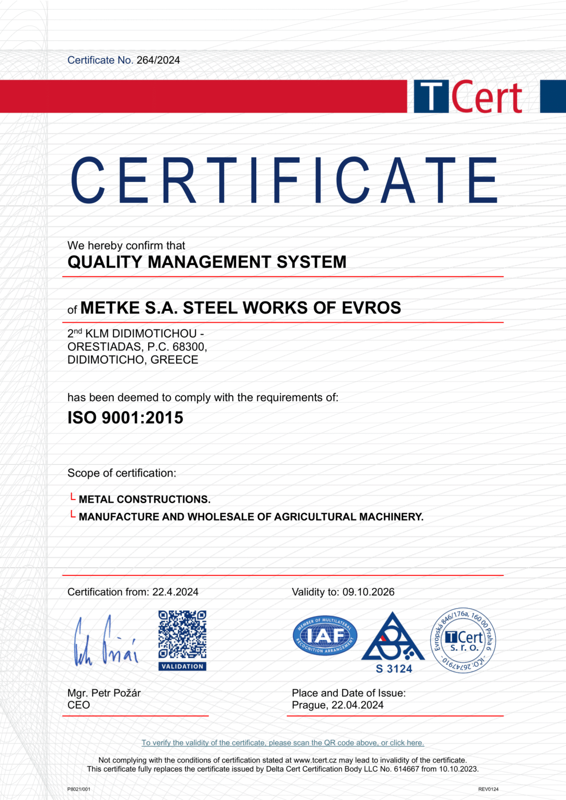 Η ΜΕΤΚΕ είναι πιστοποιημένη εταιρεία σε μεταλλικές κατασκευές και κατασκευή και εμπορία γεωργικών μηχανημάτων!